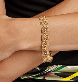 Das Armband ist mit einem Goldbad veredelt, das dem Silberdesign einen warmen Glanz verleiht und die zarten, filigranen Verflechtungen noch weiter hervorhebt. Dieser Kontrast zwischen dem Glanz des Goldes und der Komplexität der Filigranarbeit macht das Armband zu einem kostbaren und unverwechselbaren Accessoire.